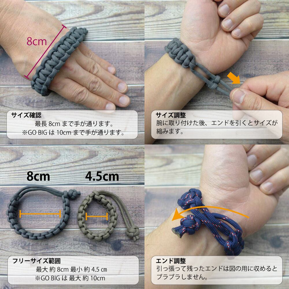 550パラコードで編まれたサイズ調整できるフリーサイズのブレスレットです。550パラコードは1本で250kgの耐重性能を持っていますので災害時、遭難時等で解いて約2メートルのロープとしてご利用頂けます。マッドマックス風のデザインでカラーバリエーションが豊富です。是非 ■アウトドア ■防災 ■ファッションアクセサリー としてご利用ください。